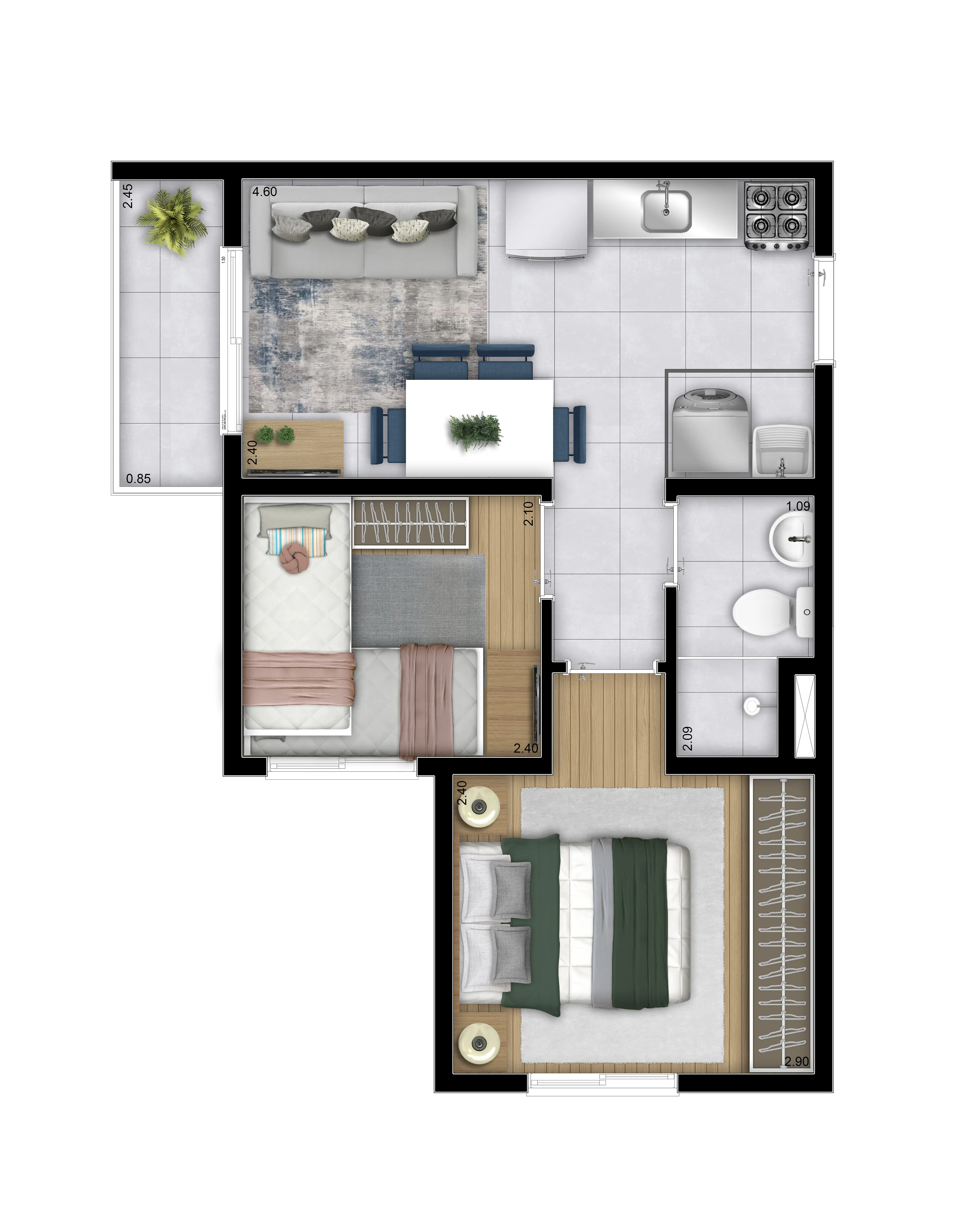 Torre B - Aptos Tipo 1 dorm. c/ terraço: 27,00m² a 27,43m² - Aptos Térreo 1 dorm.: 24,54m² a 25,07m²