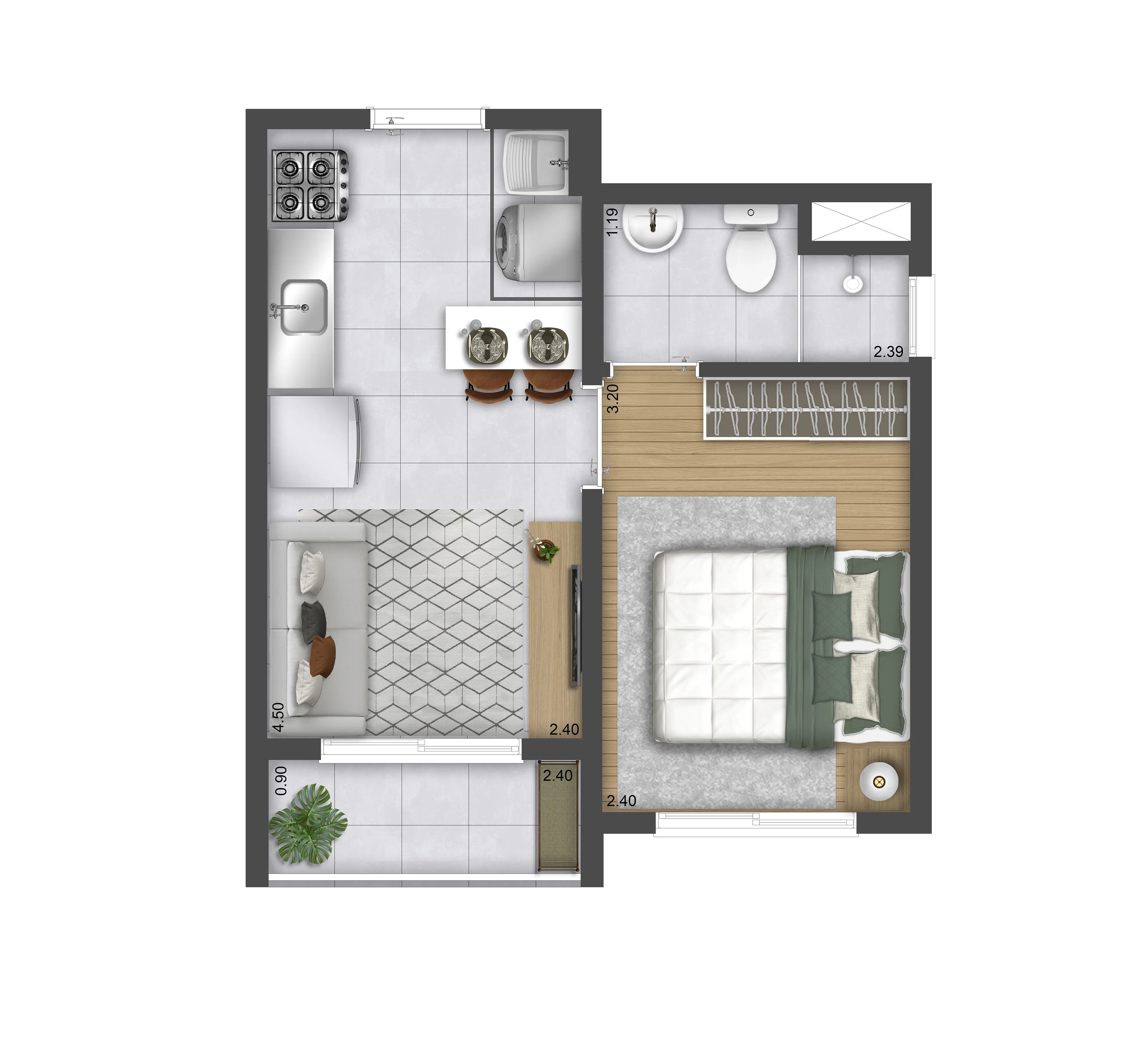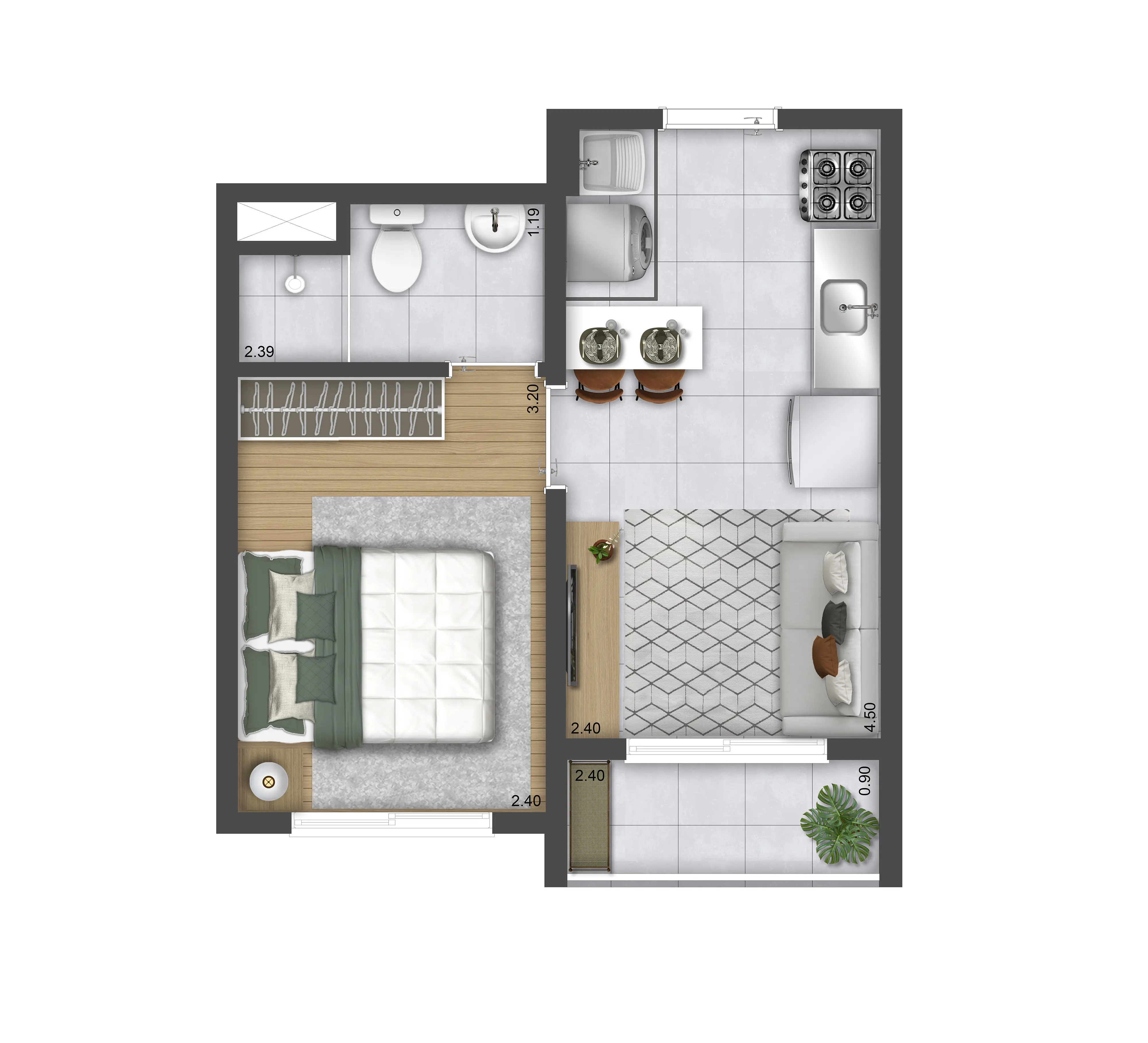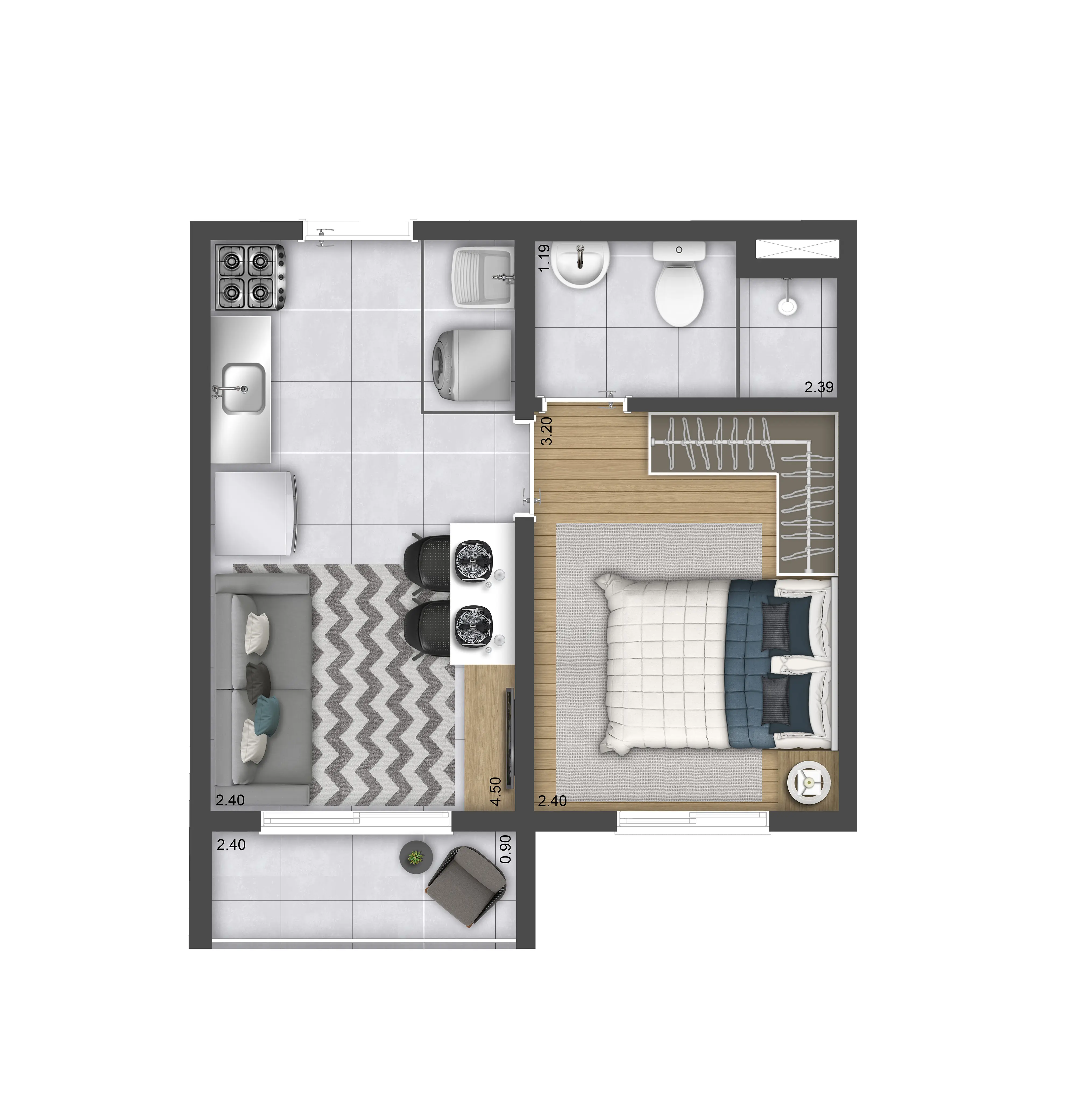 Torre C - Aptos Tipo 1 dorm. c/ terraço: 27,00m² a 27,43m² - Aptos Térreo 1 dorm.: 24,54m² a 25,07m²
