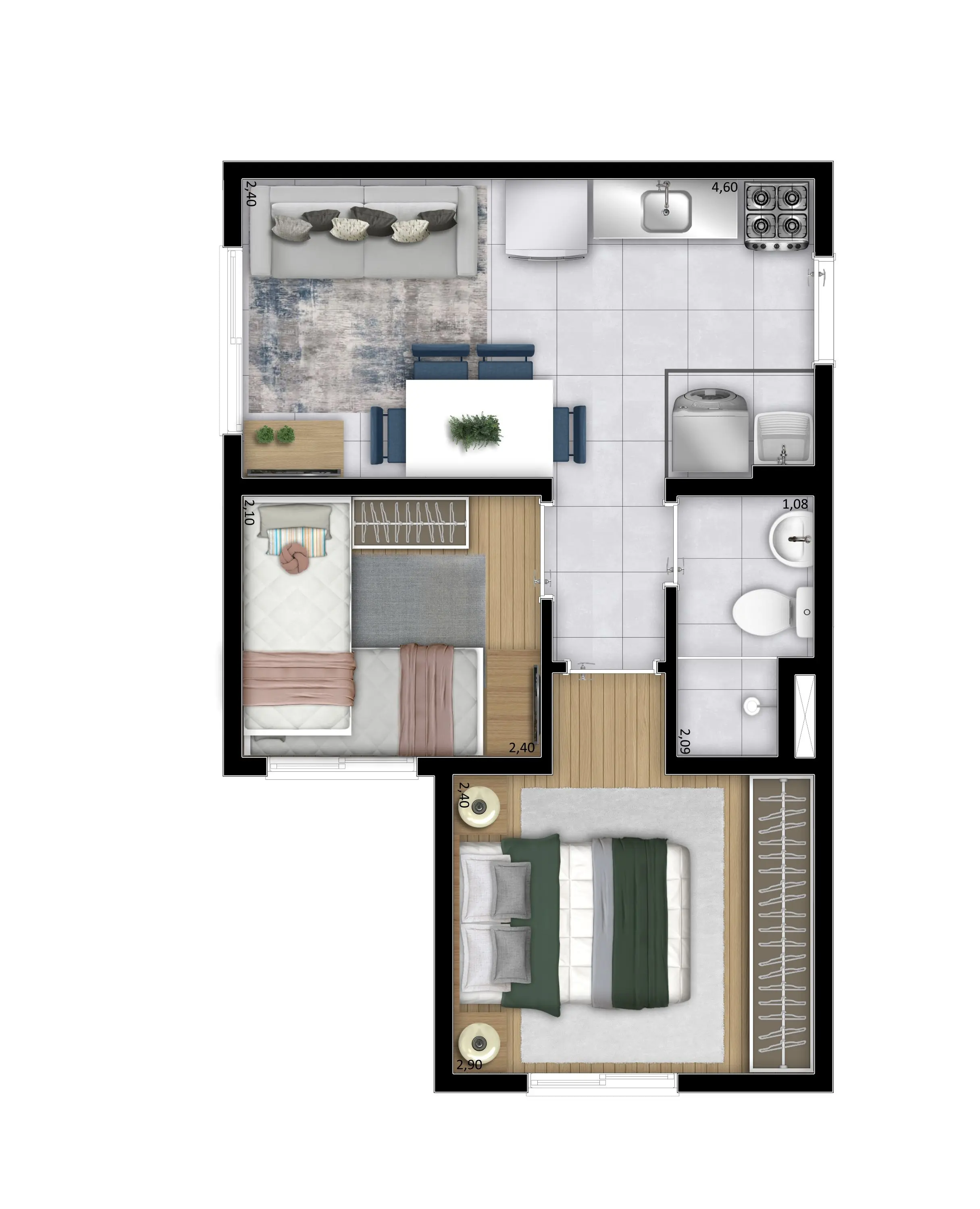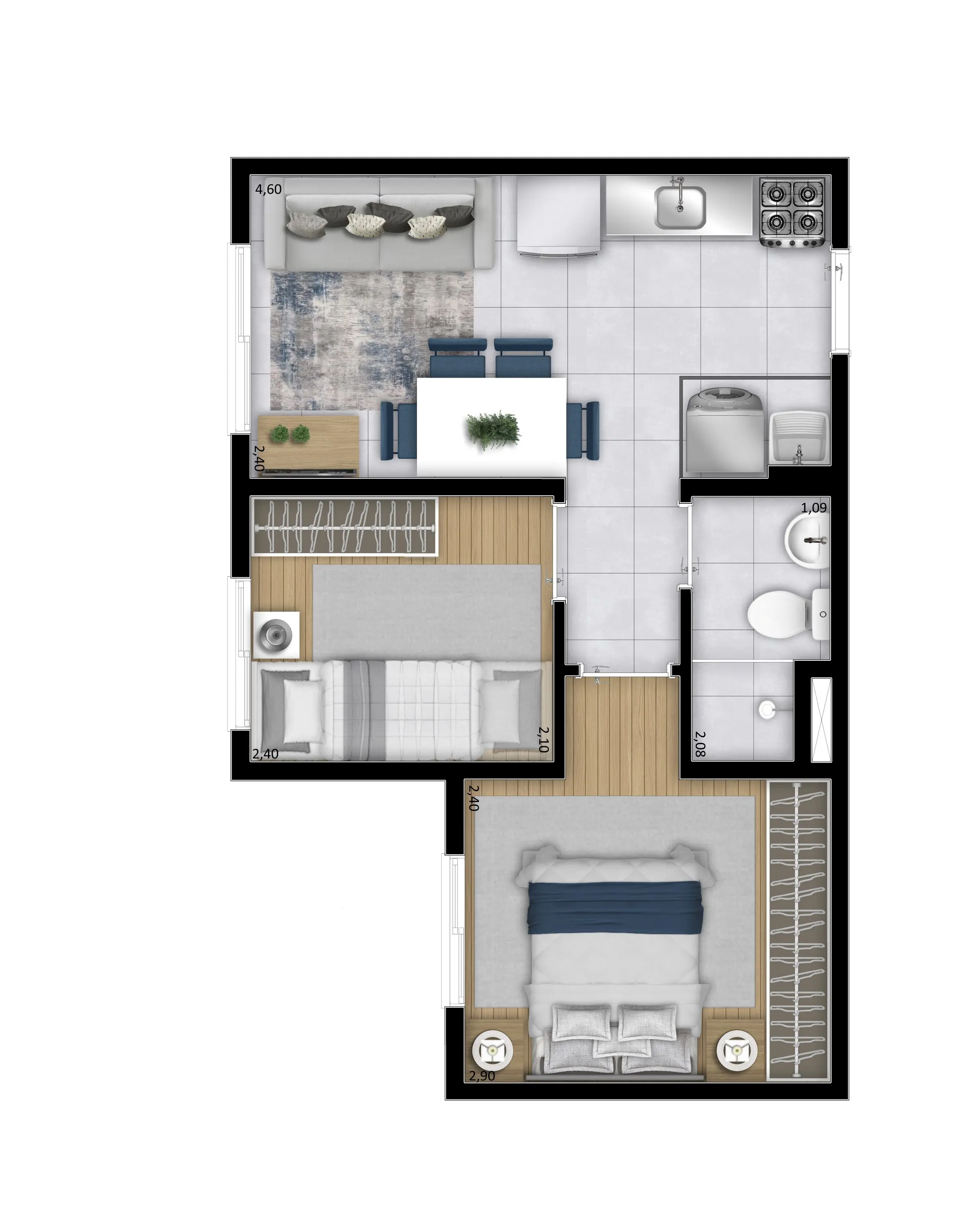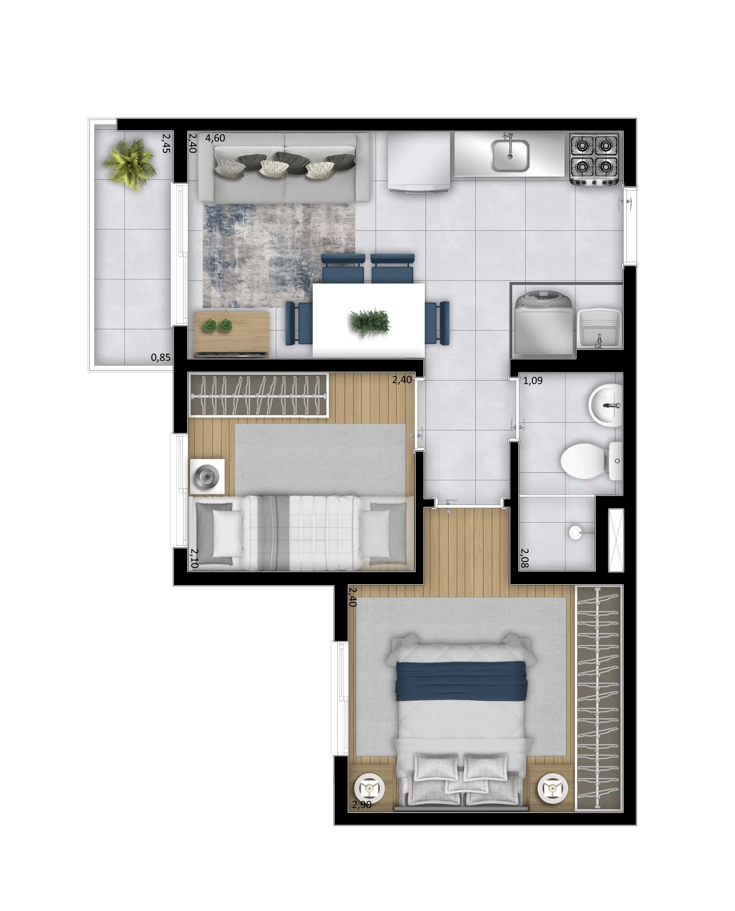 Térreo: 2 Dorms. s/ terraço: 31,78m² à 32,78m² 1º ao 24º pavimento: 2 Dorms. c/ terraço: 34,34,m² * 2 Dorms. s/ terraço: 31,68m² à 32,68m²