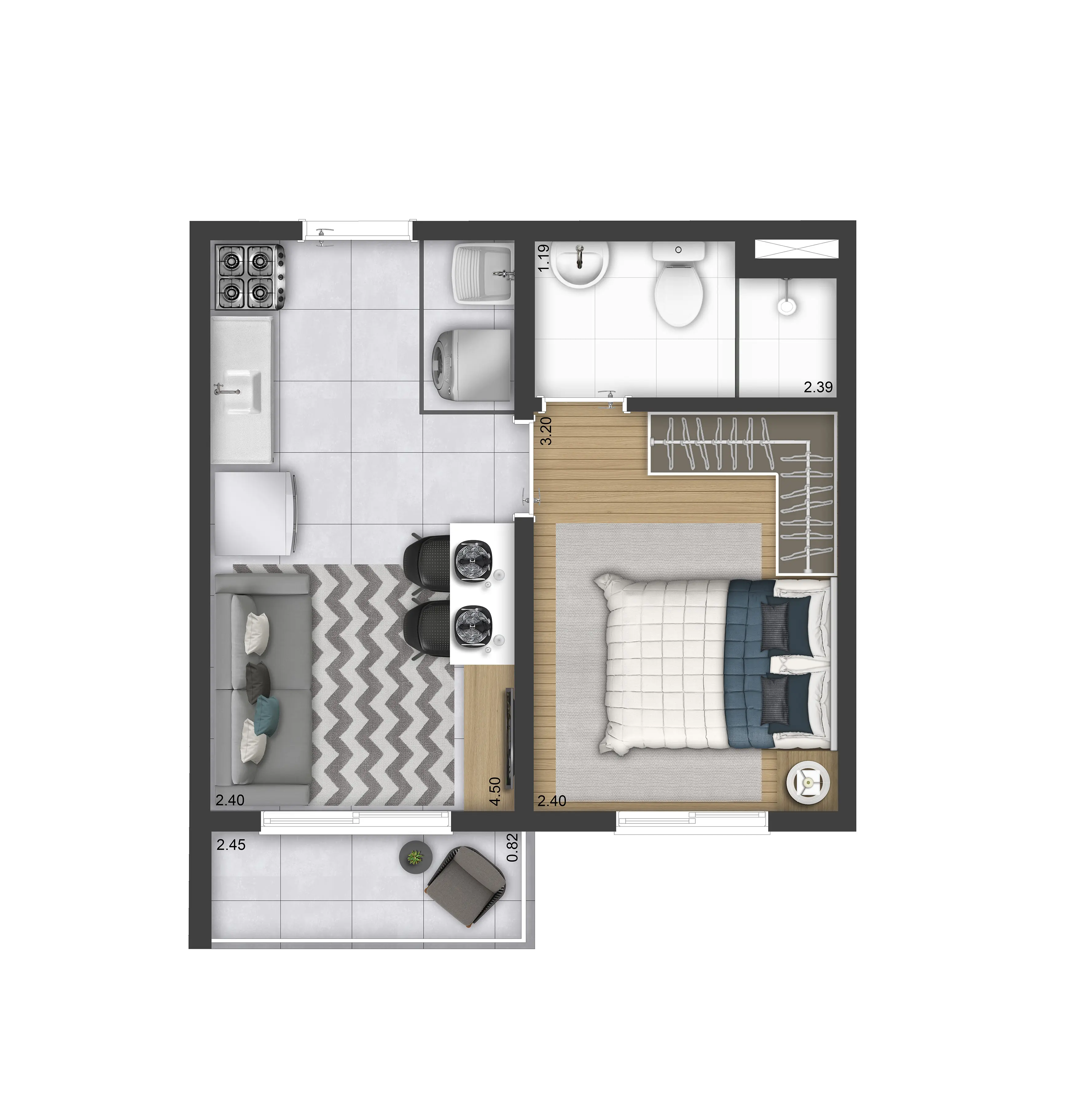 TORRE A Área privativa do tipo: Tipo 1 dorm. c/ terraço: 26,85m² a 27,27m²