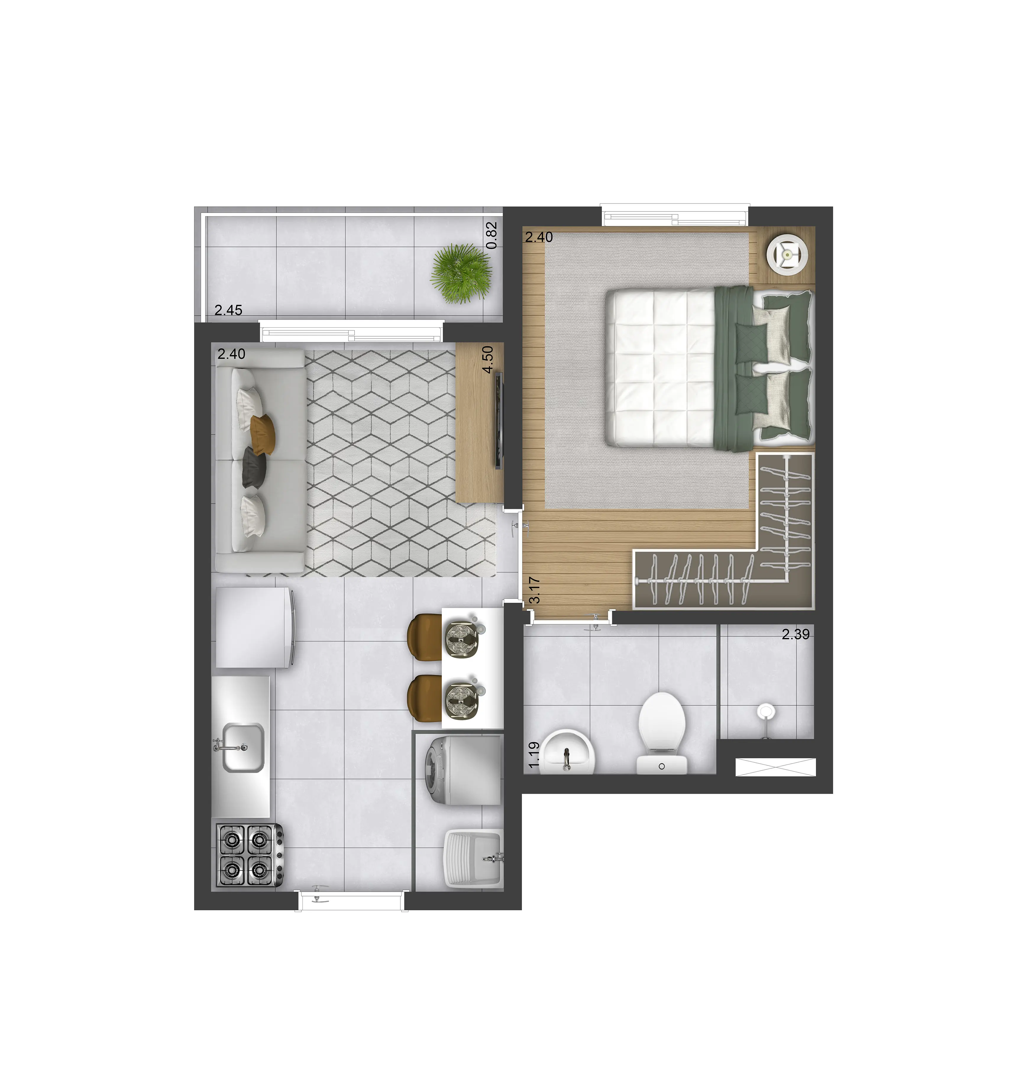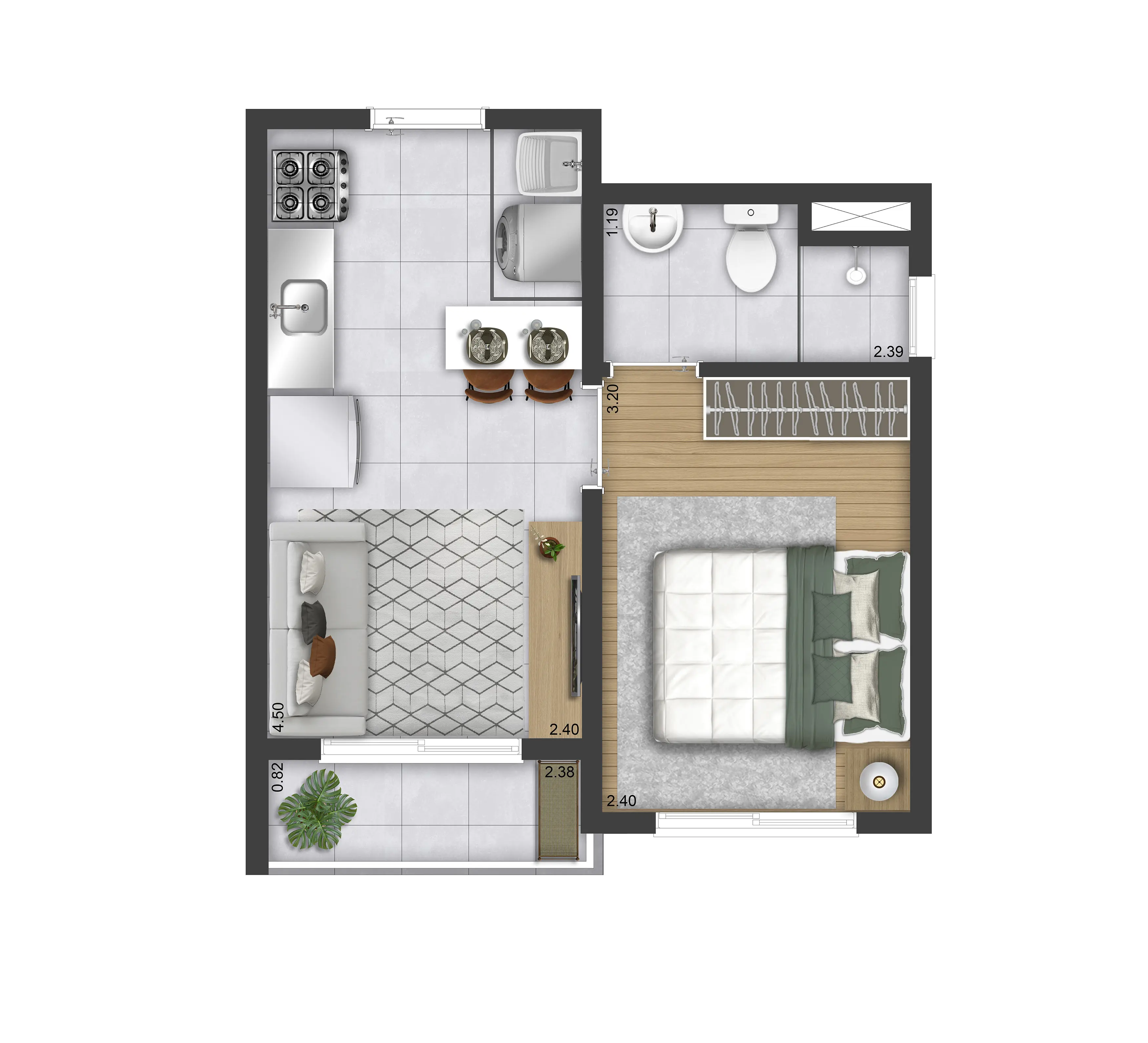 Área privativa do térreo: Térreo 1 dorm.: 24,53m² a 25,02m²